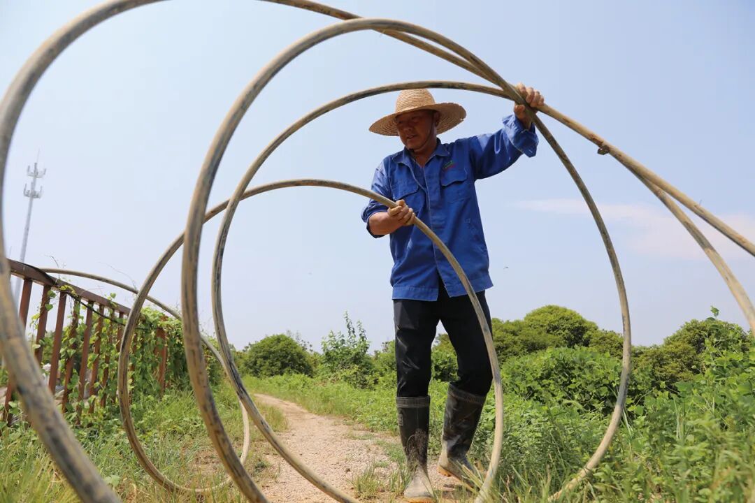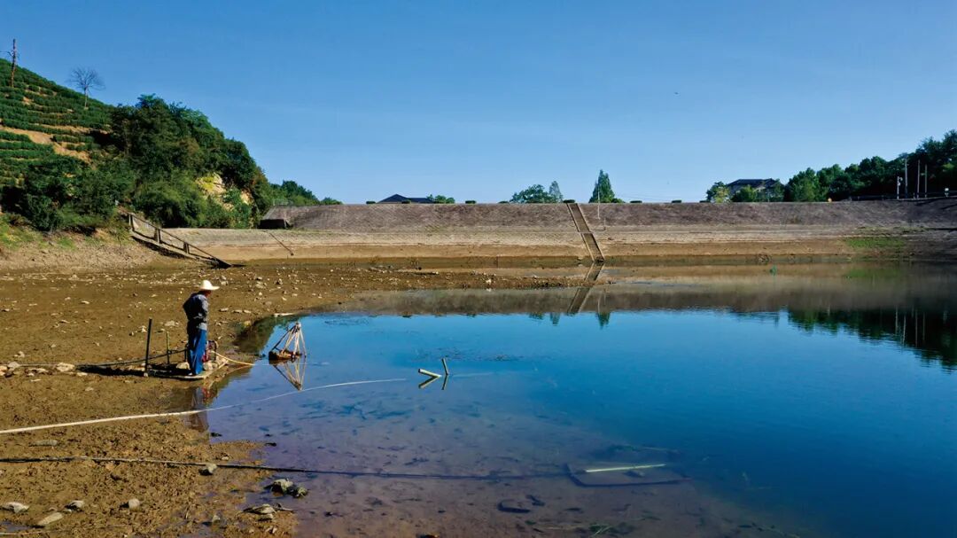 茶山浇灌用水,多是来自山下小水库和沟渠。长时间的干旱使沟渠无水可取,村民只能将水管通向更远的水库,而长距离的供水需要启用多个接力水泵,才能打到山头的喷灌。