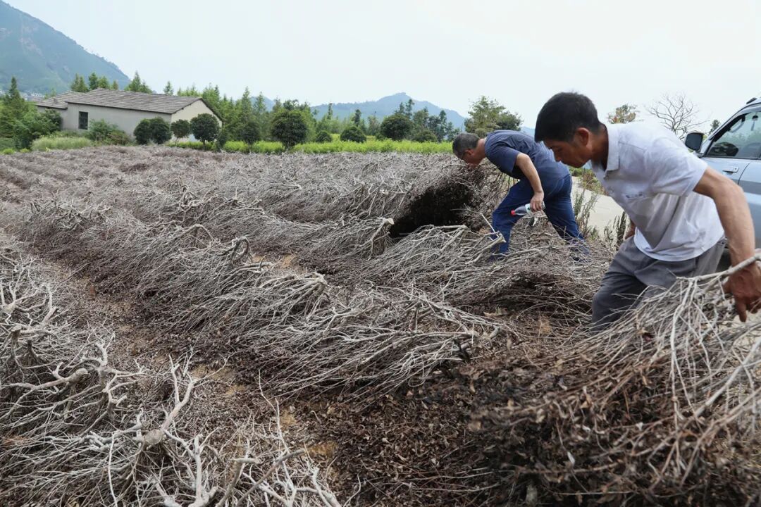 尽管山头的喷灌昼夜不停地洒水,丁金林家的四十多亩茶园还是出现了不同程度的枯黄。烈日炙烤下,山头上孤零零的几只喷灌对整片“饥渴”的茶园来说,有点杯水车薪。为了守住自家茶园,8月以来,丁金林几乎每天只睡两三个小时——山上的茶园每天要轮换浇水,山下的茶苗圃每隔两小时就要浇水降温。为了保卫白茶,丁金林全家总动员,女儿女婿们下班后,也在夜里上山浇水。▲持续高温和干旱,种茶大户陆黎丰的 310 亩茶园受损严重▲高温干旱对重度修剪的茶园来说影响更大,特别是一些过迟修剪的茶园,几乎遭遇灭顶之灾7月以来,罕见的高温干旱使得浙江湖州安吉县的白茶遭遇前所未有的危机。安吉县溪龙乡农技专家介绍,整个溪龙乡白茶受旱面积达到了60%。在“中国白茶第一村”黄杜村,1.2万亩的茶园已有30%出现焦枯现象。旱情对白茶的影响在8月中旬开始集中显现,随着炎热天气的持续,当地白茶受损也在加速扩大。而那些看不见的损失,则要等到后续显现以及明年白茶开采才能统计。安吉白茶的种植多在山地,茶园南北朝向的不同、土质的好坏、灌溉设施的有无,都会对白茶度夏造成影响。一个多月高温少雨的极端天气,正在放大这种地势差异带来的后果。地处山北的茶园,因为日照原因,普遍较山南的白茶受损小;山头的茶园较山脚和平地的茶园更易出现枯萎。甚至,一场局部不平衡的降雨,也会改变两个山头茶园的长势。出现焦枯的茶园,第二年的白茶产量将减少一半,严重的甚至无茶可采。一些环境更加恶劣的茶园,眼下正面临生死“烤验”。