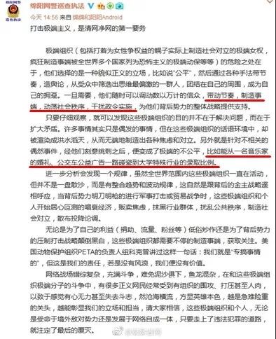 绵阳网警一则“打击极端女权”的微博公告,