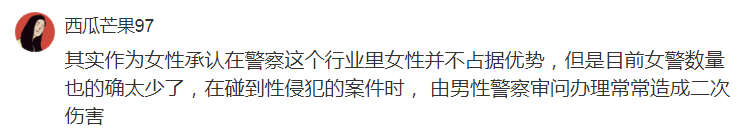 例如上文提到的,女警察的女性立场,可以增强涉及女性受害者案件的立案率,满足更多女性的安全需求。
