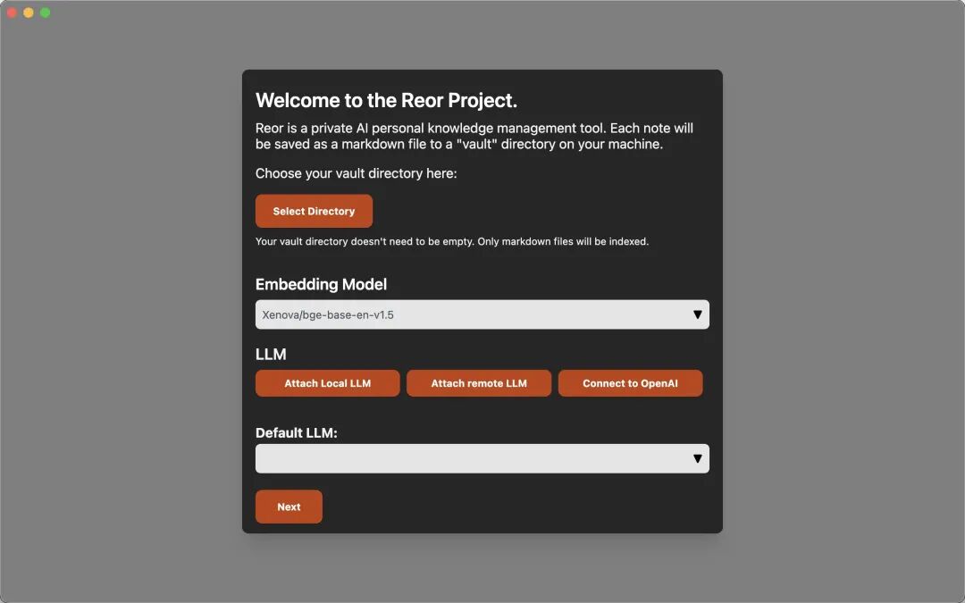 初始化。包括导入你的笔记文件夹、Embedding和LLM的设置。其中Reor要求导入的笔记是markdown(.md)文件,它是现在的主流笔记软件Obsidian、Logseq、Typora等默认的文件格式,非常通用。