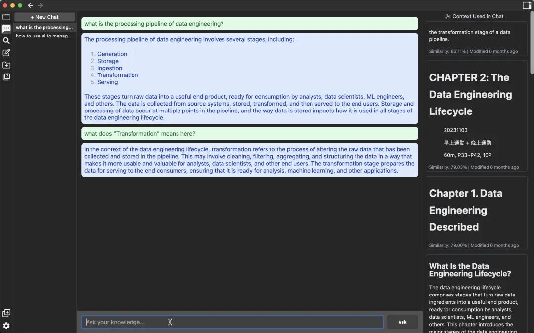 比如问数据工程相关的问题,它会结合我关于“Fundamentals of Data Engineering”这本书的读书笔记来作答: