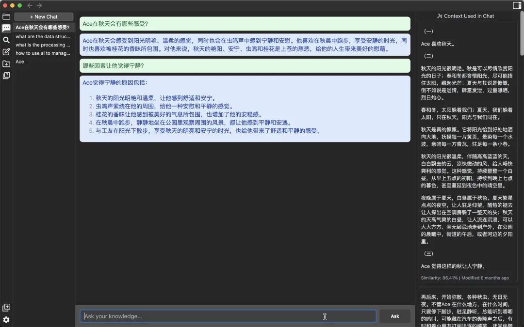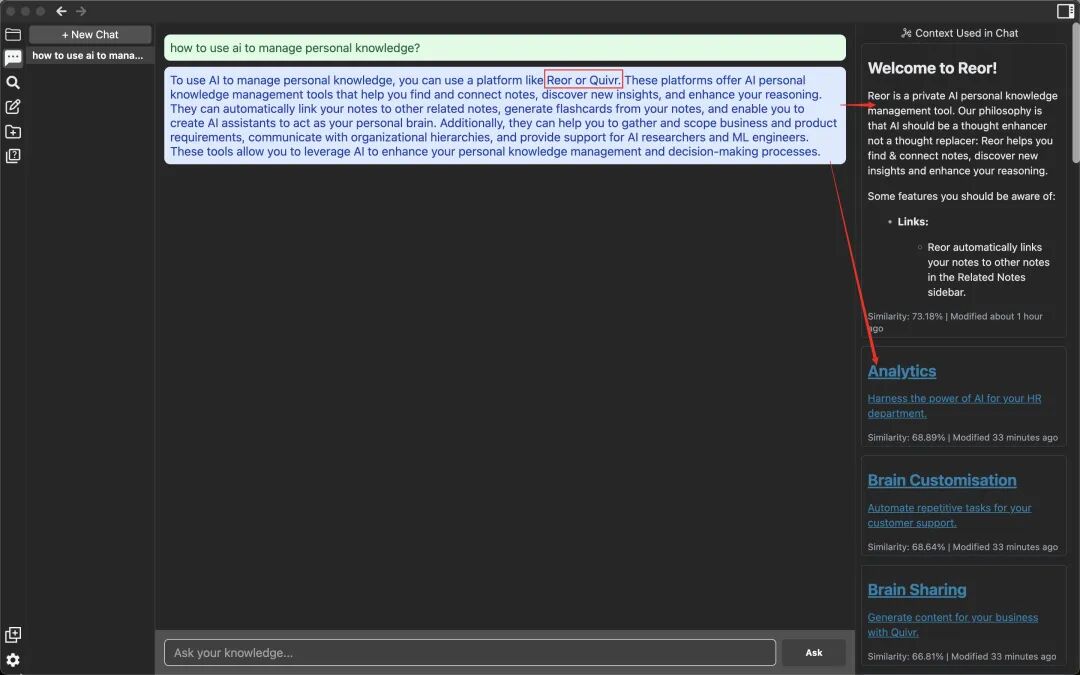 AI问答。与Quivr一样,Reor支持用AI就你的笔记展开对话,它会搜索你的笔记内容,汇总相关知识并回答,并给出相关笔记作为引用源。比如问它“如何使用AI做个人知识管理?”,AI会结合我笔记中的Reor和Quivr相关的介绍文章,给出对应的答案: