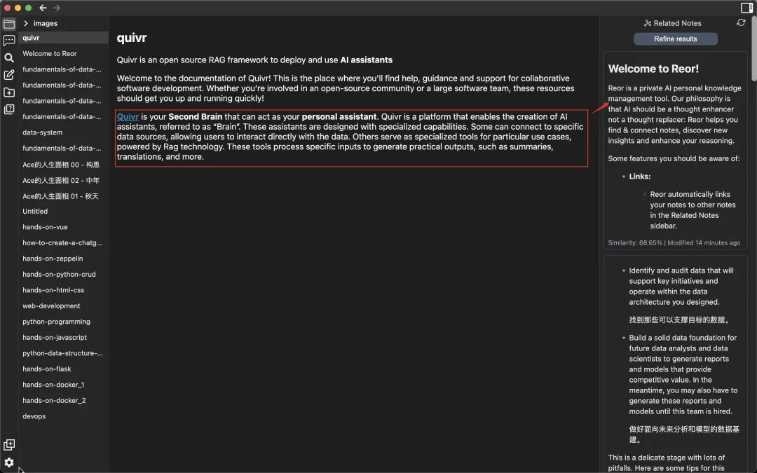 输入Quivr介绍的内容后,Reor就非常及时地展示出与它相关笔记是“Reor”!这是创作者想要的,发现知识之间的隐秘联系,引发思考和灵感: