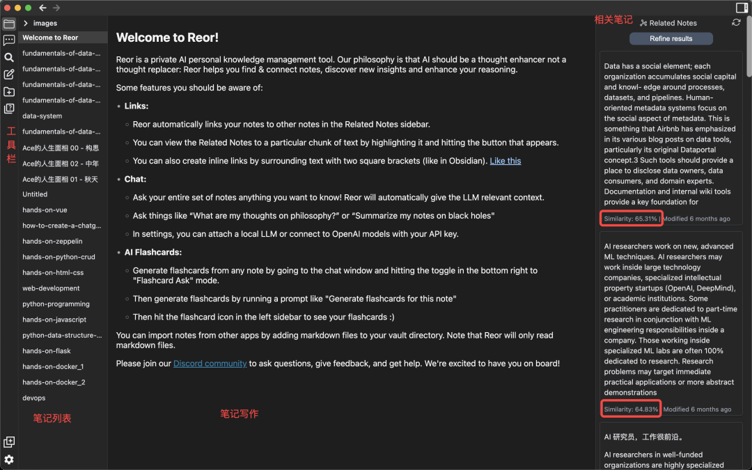 前几天介绍了Quivr,一款用AI帮助个人管理知识、构建第二大脑的人工智能应用。不过Quivr侧重的是将你已有的、很大可能是从其他地方得来的知识文档(比如PDF、 Word等)汇总成不同主题的Brain,这个汇总的过程是手动的,需要用户自己介入的。而喜欢自己做笔记、写东西的创作者来说,如何自动化地在知识之间建立内在的连接、发现不同时间想法之间隐藏关联,从而激发灵感、增进思维,可能是更重要的助力。而Reor就为此而生。