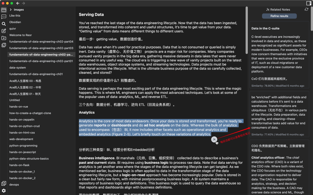 相关笔记。这是通过语义的相关性,对每段话都生成了相关的笔记段落。