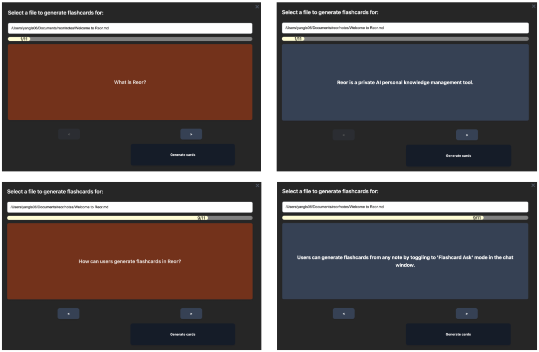 AI闪卡。为了加强对知识点的记忆,很多人会制作闪卡(一面是问题,另一面是答案的卡片)来辅助。Reor通过AI来自动生成闪卡。下面是针对Reor介绍文章的闪卡制作,它包含了11个问题和对应的答案: