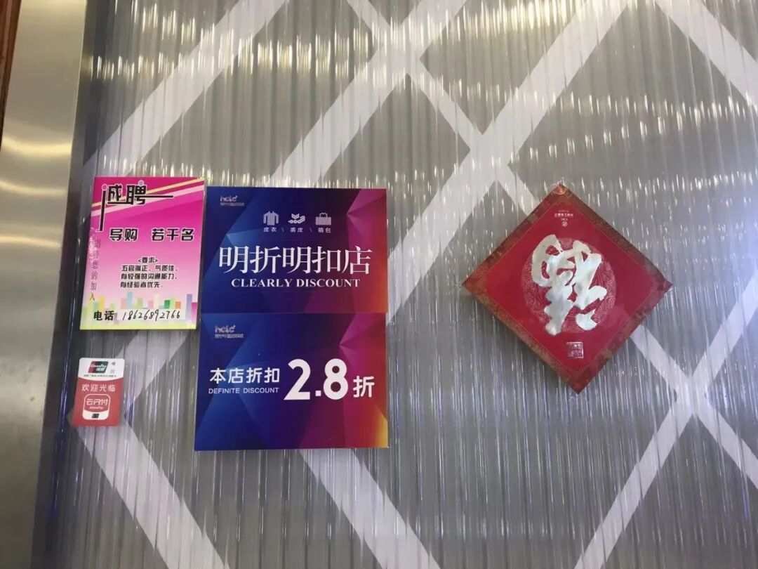 另外每个店门口都有统一模板的卡片,提示你此刻的折扣(力度大的像大甩卖),我进去翻了翻吊牌,想起小时候我妈100块给我买的毛衣吊牌价800块,经年过去,套路依旧。