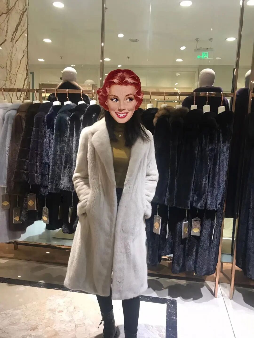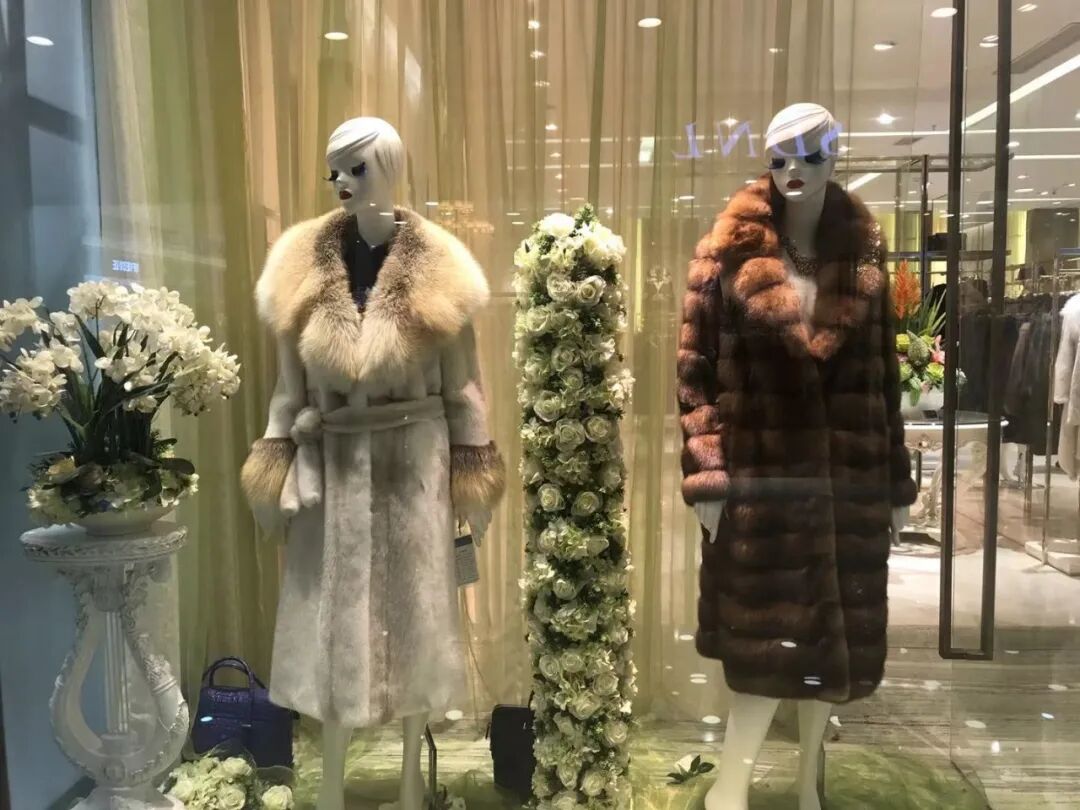 就这样,化着精致妆容又高又瘦还穿着高跟鞋的店员姐姐穿上了貂,在镜子前转了3圈。