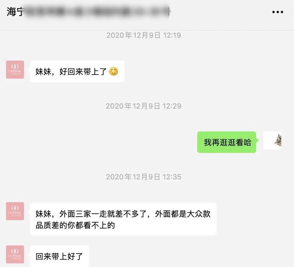 我说再去看看,店员姐姐一边催我别看了,就他们家最好,一边喊我加她微信,递给我一张名片,叫我一会儿想好了赶紧来,货不多,说不定一会儿没了。
