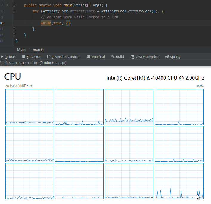 上面的意思就是我要在第 5 个 CPU 线程执行死循环,把 CPU 利用率打到 100%。