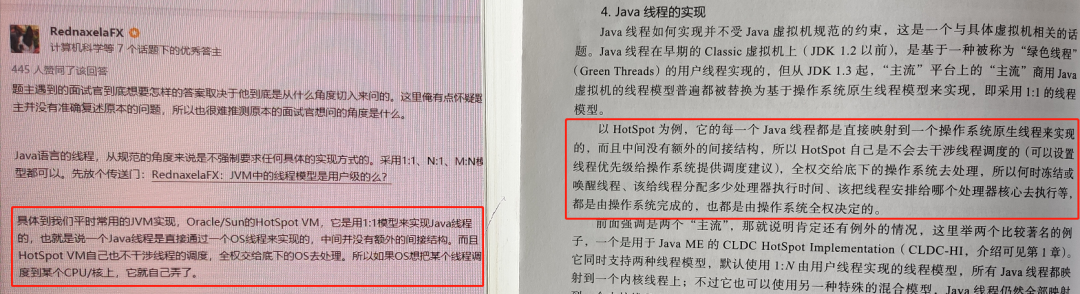 说人话就是一个 Java 线程是直接映射为一个操作系统原生线程的,中间没有额外的间接结构。HotSpot 虚拟机也不干涉线程的调度,这事全权交给底下的操作系统去做。