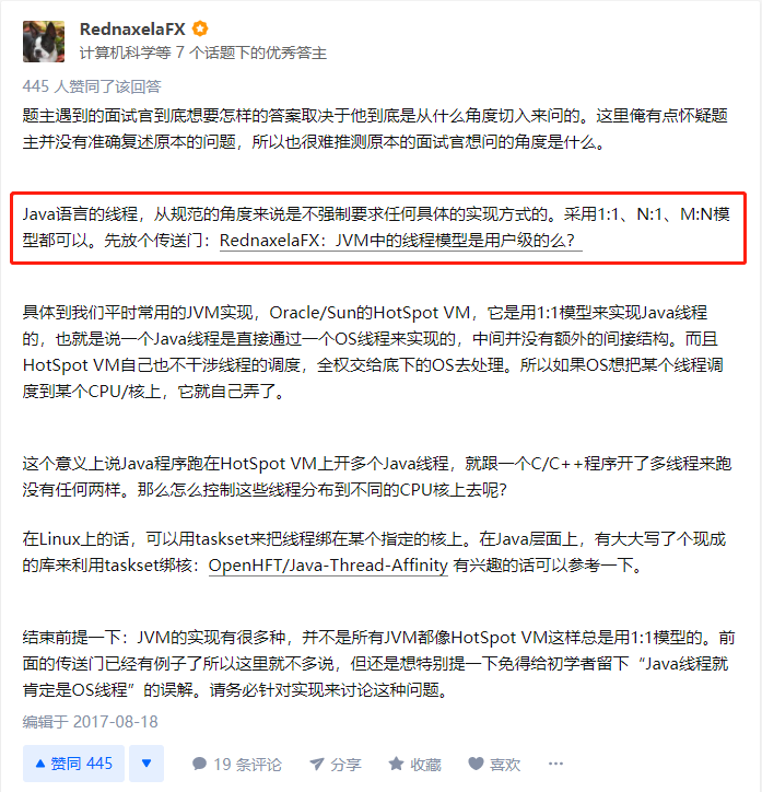 因为我们用的最多的 HotSpot 虚拟机,就是采用 1:1 模型来实现 Java 线程的。