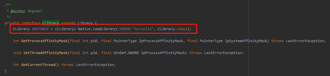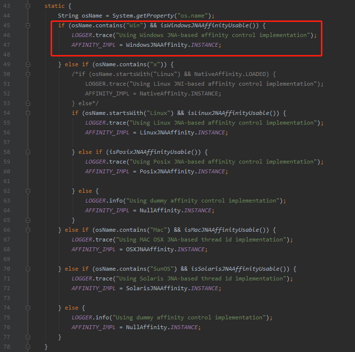 比如,在实现类 WindowsJNAAffinity 里面,你可以看到在它的静态代码块里面调用了这样的逻辑: