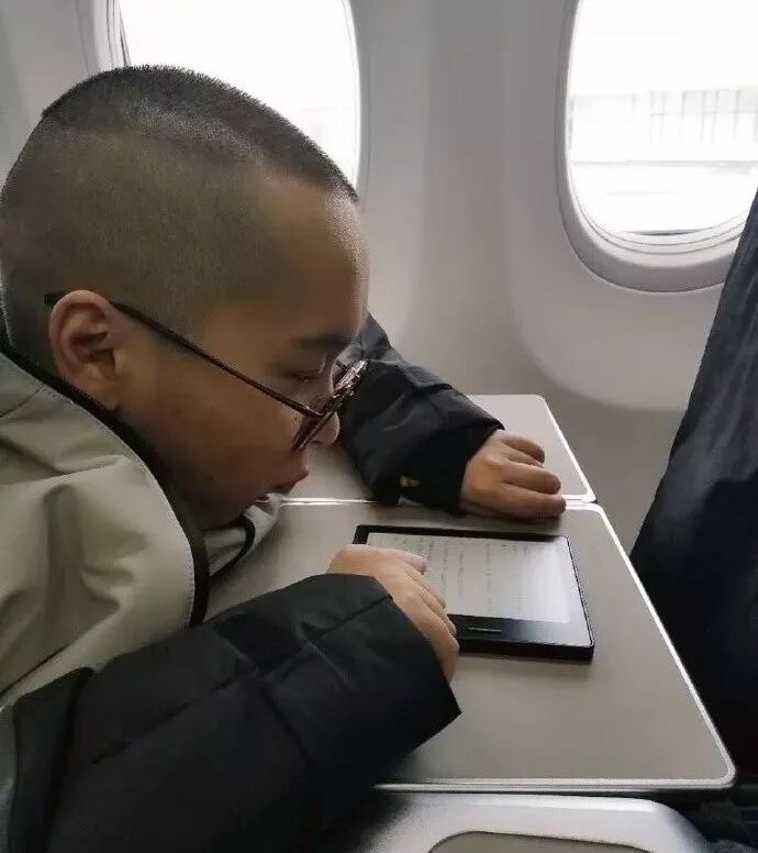 在飞机上依旧拿着平板阅读的罗罔极。 图/ 罗罔极微博