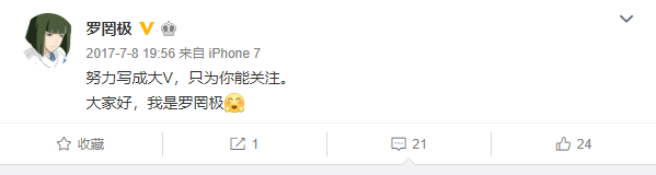在罗罔极发的第一条微博中,他表示要“写成大V”。图/ 网络
