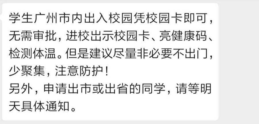 有些院校并未封闭,学生只需以证件和健康码就能出入如常;而采取封闭校园者,其规章也并非全然地不允许校内人员出入。受访者普遍反馈,教职工可以自由进出校园;而对于学生,禁闭也并非全然——允许外出,但要有程序审核。