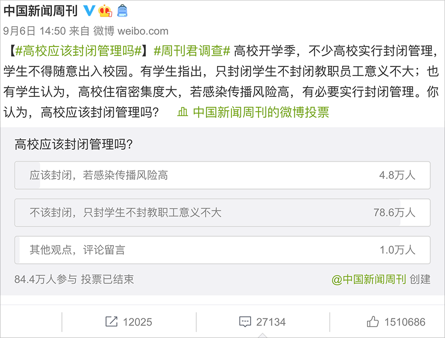 校园封闭对学生最大的影响,便是使他们的活动范围被划定于围墙之内。新浪微博的话题“开学后的栅栏式生活”点击量已高达835万,一项万人投票中,有93%的人认为不应该封闭管理。