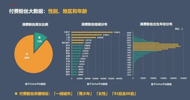 国内最大的明星粉丝互动平台“Owhat”对其用户进行画像,得出4个关键词:“一线城市”、“青少年”、“女性”、“95后及00后”。据“Owhat”数据,女性粉丝占比近九成;90后占粉丝总数90%以上,其中50%为95后;来自一线城市的占比达54.75%,二线城市有19.03,其它城市占26.22%。