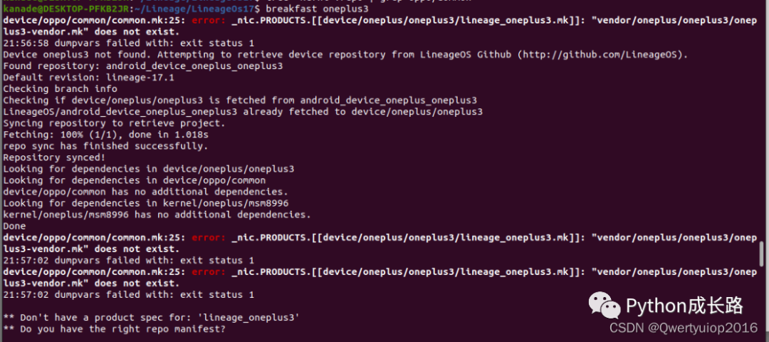 device/oppo/common/common.mk:25: error: _nic.PRODUCTS.[[device/oneplus/oneplus3/lineage_oneplus3.mk]]: "vendor/oneplus/oneplus3/oneplus3-vendor.mk" does not exist.一开始我以为是同步的时候有什么漏掉了,所以我运行了