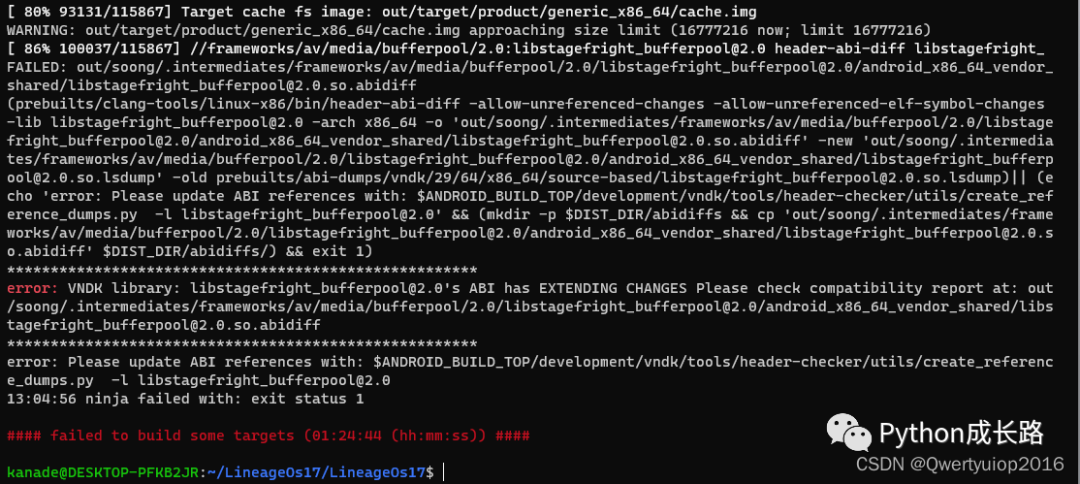 错误原因不知道,搜遍解决方法只有跳过检查。终端执行export SKIP_ABI_CHECKS=true 再执行mka就能编译成功
