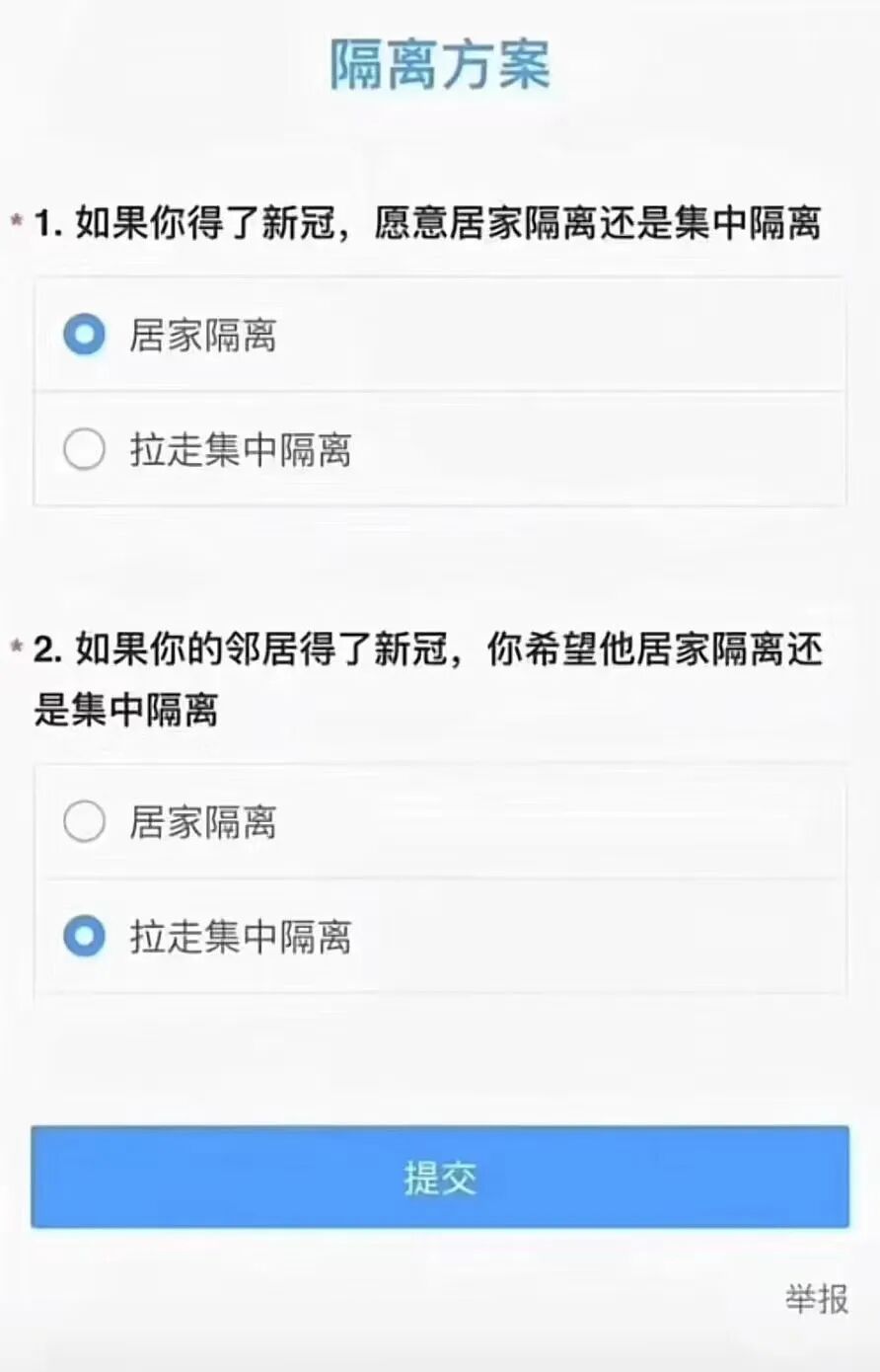 这段话对于我们解答放开之后的公众心态转型难题,具有十分重大的参考意义。还是回到前边那个问题,假如你或者邻居感染,是居家隔离还是集中隔离?这个调查最大的问题在于调查本身。