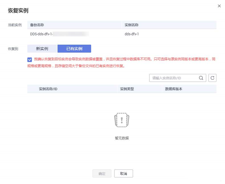 基于已有的自动备份或手动备份,将备份数据恢复到已有实例,覆盖已有实例的数据。恢复到已有实例会导致实例的帐号密码被备份文件中保留的帐号密码覆盖。只可选择与备份所属原实例同版本或更高版本,同规格或更高规格,且存储空间大于备份文件的已有实例进行恢复。