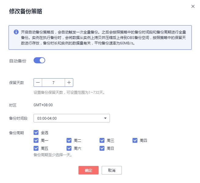 系统自动创建数据库实例的全量备份,用户可以配置自动备份开始时间段和自动备份保留期。