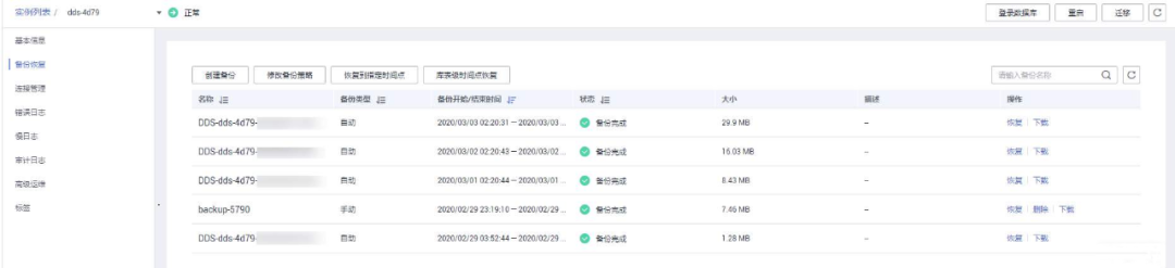 描述:文档数据库服务DDS支持使用已有的自动备份和手动备份,恢复实例的数据。