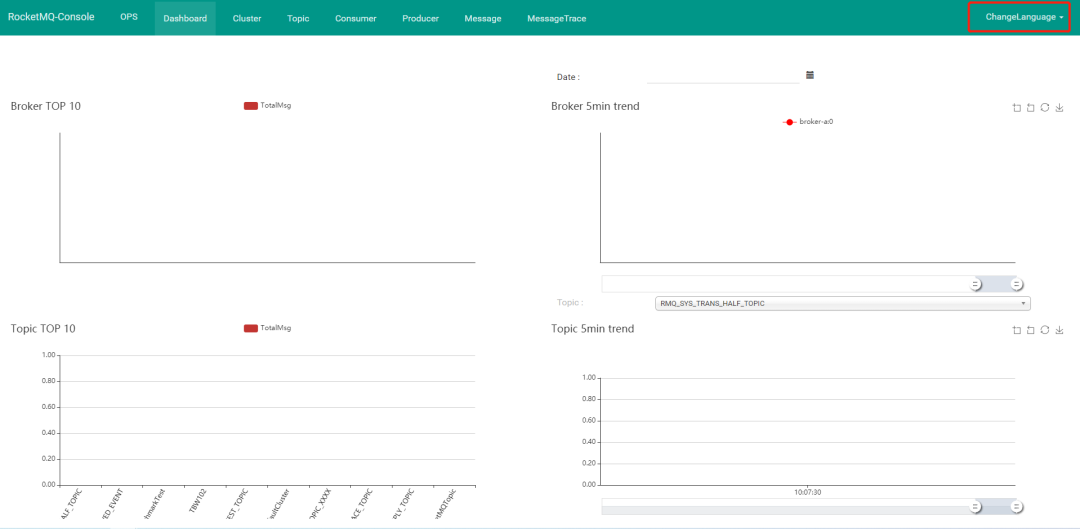 左下角消息的消费的消费,因为我们还没有消费者订阅这个topic,所以左下角没数据。