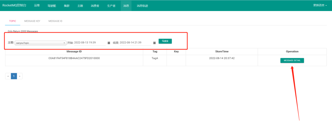 到控制台看到消息那块,然后选定发送的topic,查询的时间范围手动再选一下,不选就查不出来(我怀疑这是个bug),然后查询就能看到了一条消息。