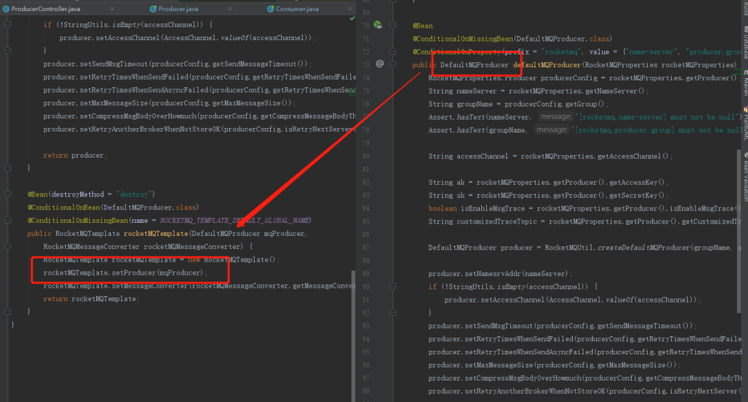 所以从这可以看出,最终在构造RocketMQTemplate的时候,传入了一个DefaultMQProducer,所以可想而知,最终RocketMQTemplate发送消息也是通过DefaultMQProducer发送的。