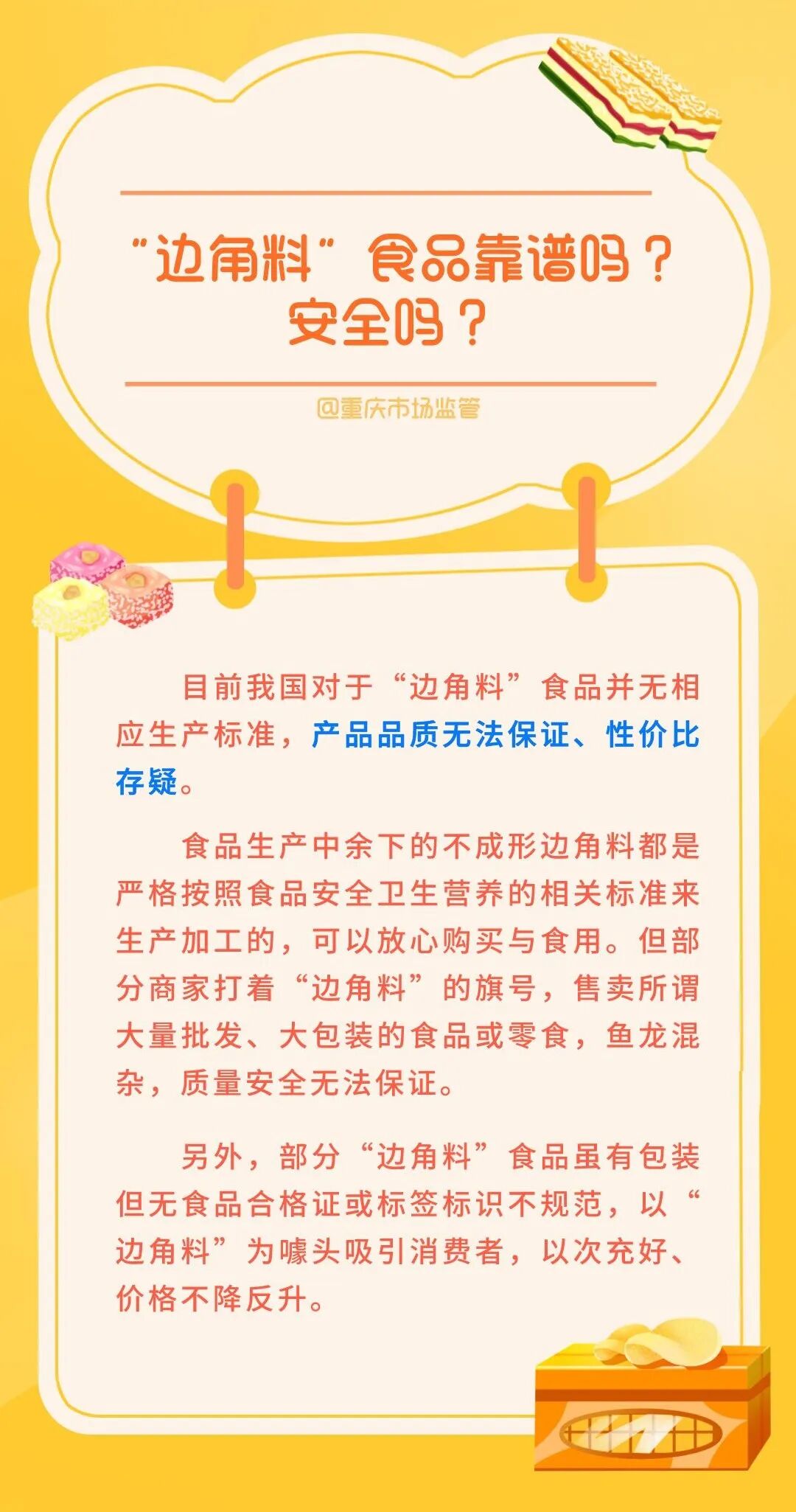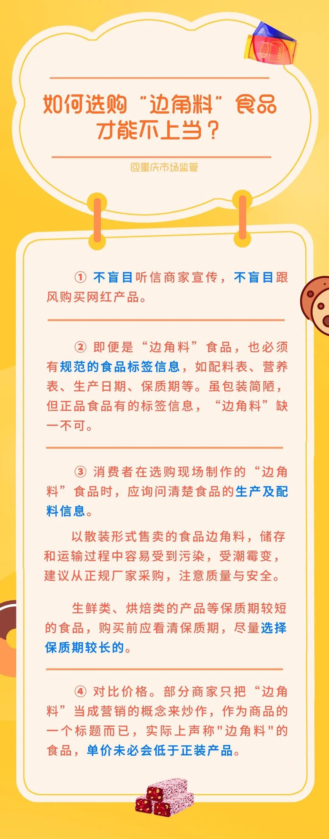 “捡漏”虽好,安全须第一,追求实惠的同时,消费者选购时也要擦亮眼睛。厂家在加工过程会优化工艺,尽量减少边角料的生成,生产正装食品时产生边角料的量要比正装少得多,广大消费者对电商平台上动辄销量10w+的“边角料”食品需提高警惕。