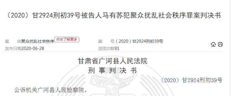 被告人马有苏,男,1980年1月5日出生,东乡族,文盲,农民,甘肃省广河县人,住甘肃省广河县。2018年10月15日因进行非法传教活动被康乐县公安局行政拘留十日。于2020年2月6日因涉嫌聚众扰乱社会秩序罪被广河县公安局刑事拘留,同年2月20日经广河县人民检察院批准逮捕,次日被广河县公安局执行逮捕。现羁押于广河县看守所。