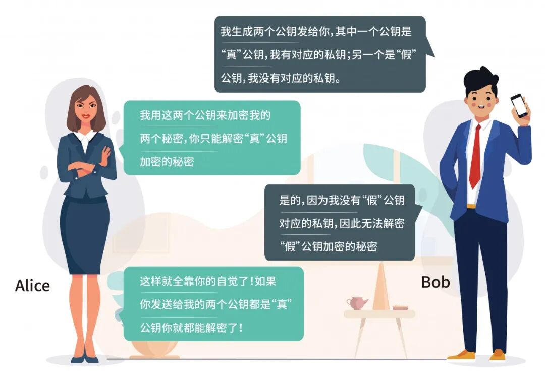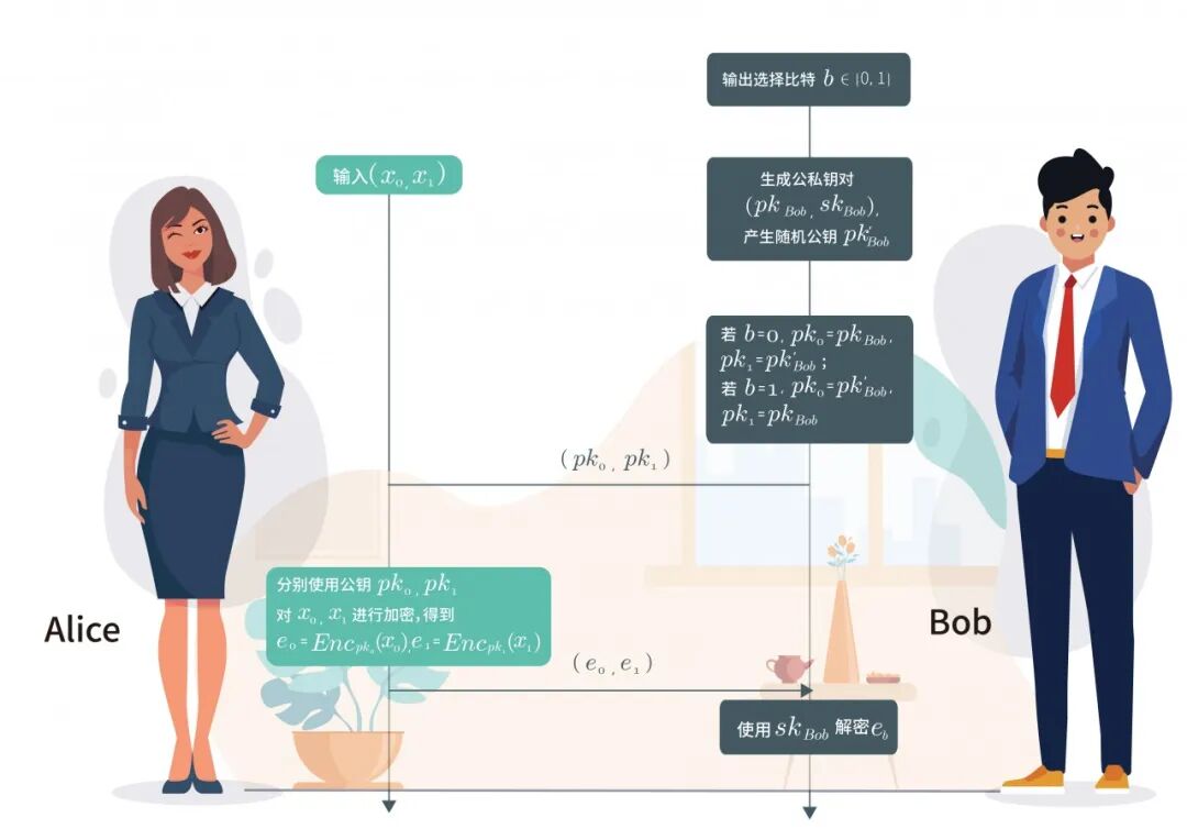Bob不知道𝑝𝑘′Bob所对应的私钥,也就只能解密(𝑒0,𝑒1)其中之一,无法解密Alice使用𝑝𝑘′Bob加密的𝑥1-b。