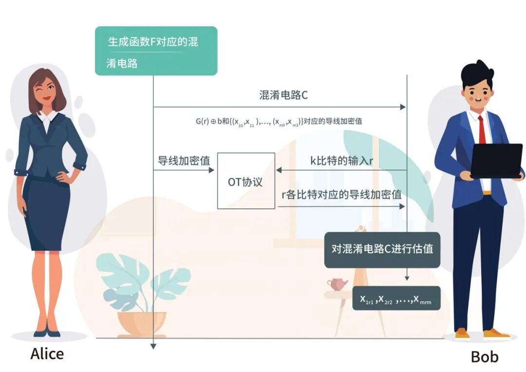 之后Alice将混淆电路以及𝐺(𝑟)⨁𝑏和{(𝑥10,𝑥11),(𝑥20,𝑥21),…,(𝑥m0,𝑥m1)}对应的导线加密值发送给 Bob,Bob则通过𝑘次OT协议获取对应的输入导线的加密值,进行电路估值。
