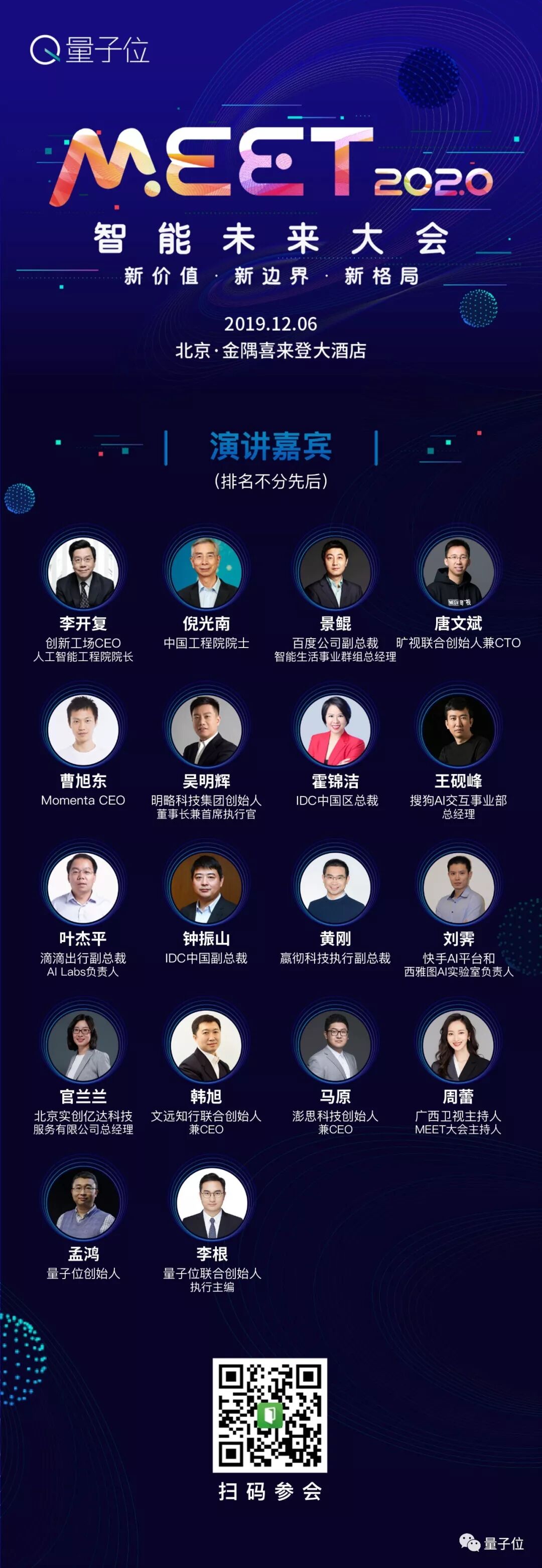 量子位 MEET 2020 智能未来大会启幕,李开复、倪光南、景鲲、周伯文、吴明辉、曹旭东、叶杰平、唐文斌、王砚峰、黄刚、马原等AI大咖与你一起读懂人工智能。观众票已售罄,欢迎大家戳链接预约直播:http://vku.youku.com/live/ilproom?id=8029679