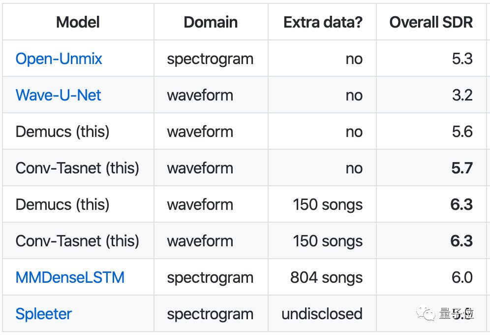这两种方法在MusDB上的训练结果已经接近了频域方法的最优结果,加入150首额外的训练数据后,总体信号失真比(overall SDR)达到了6.3,超过了其他所有方法。