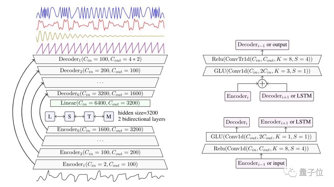 上图是Demucs的完整框架结构,右侧是编码器和解码器层的详细表示。