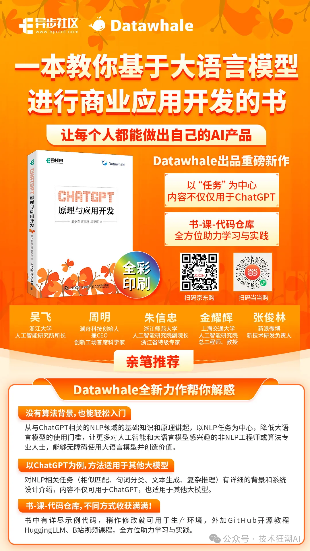 Datawhale团队最新推出的“蝴蝶书”——《ChatGPT原理与应用开发》,这本书源自Datawhale开源项目HuggingLLM,GitHub 2K+星、B站播放量超30万,是Datawhale在打造了“南瓜书”“蘑菇书”“熊猫书”后,推出的第4本王牌之作。
