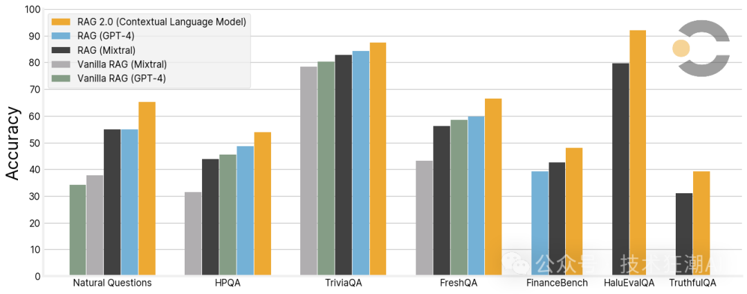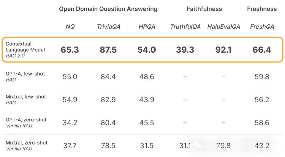 在这些测试中,RAG 2.0展现了其卓越的性能,它通过端到端的优化,将语言模型和检索器作为一个统一的系统进行训练和调优。这种优化方式使得RAG 2.0在处理开放域问答任务时,能够更有效地检索相关信息,并生成准确和全面的答案。根据Contextual AI的官方介绍,RAG 2.0在这些基准测试中的表现显著优于使用GPT-4或开源模型Mixtral构建的冻结RAG系统。
