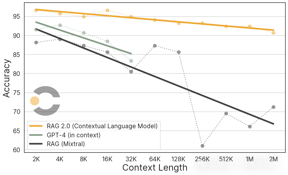 与长上下文模型的比较进一步证明了RAG 2.0的优势。长上下文模型虽然能够处理大量信息,但RAG 2.0在准确性和计算效率上的表现更为出色,这表明它在自然语言处理的多个方面都能提供更优的性能。