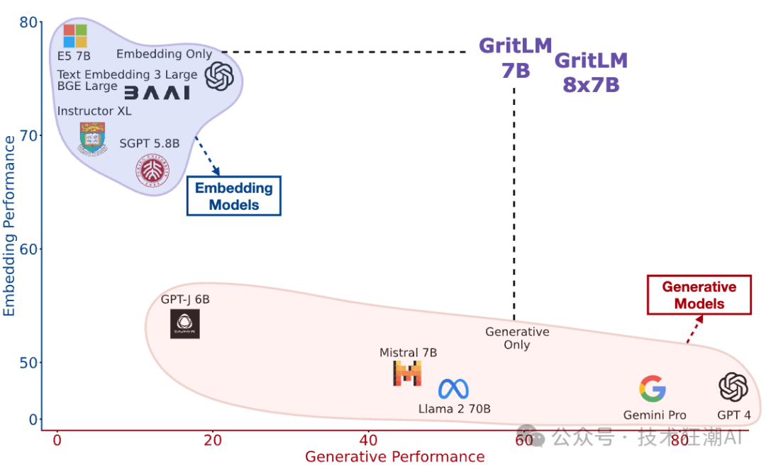 那么,我们能不能只训练一个模型,让它同时擅长生成和表示呢?答案是肯定的。使用 GRIT ( 生成式表示指令调整 ) 技术,我们可以训练出这样的模型,它不仅能生成高质量的文本,还能有效地进行信息检索。