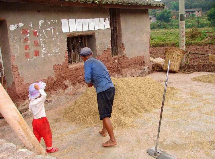 稻子收回家,那就是晒稻谷,晒上几天太阳,再用风车将瘪谷子吹掉,剩下的饱满谷才入仓。
