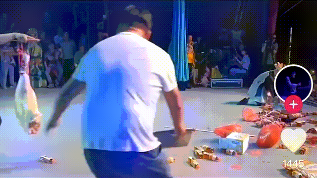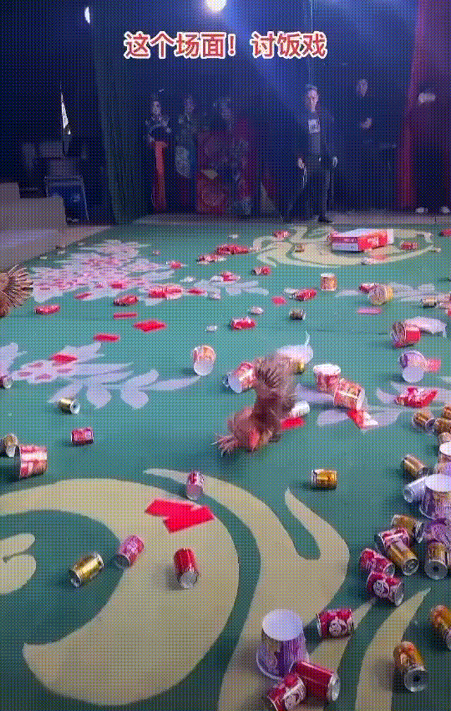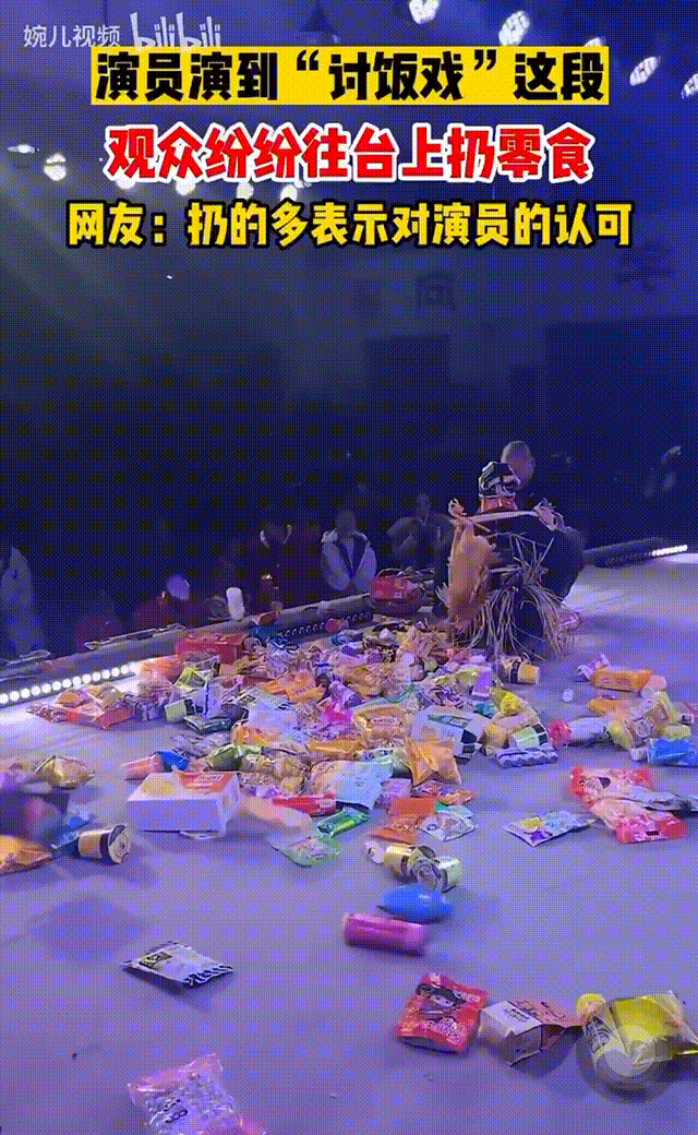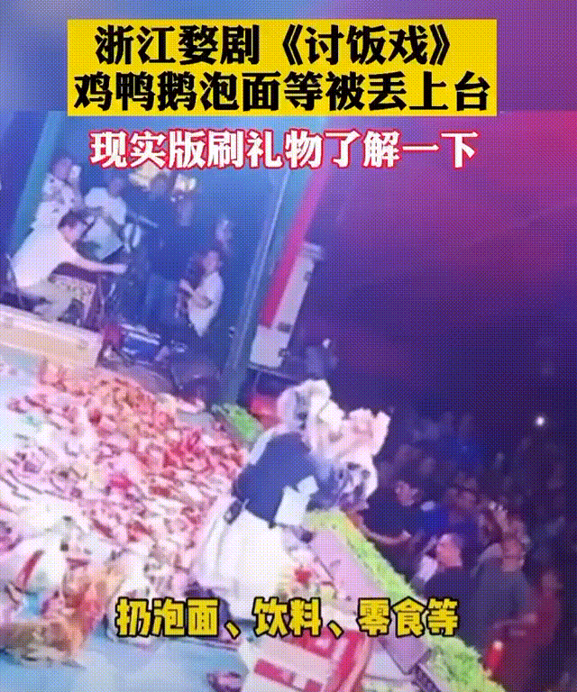 台下的观众在疯狂往台上给演员投掷食物,还有人成箱搬运泡面和饮料上台。感觉跪在台上的演员收拾收拾东西,就能村口去开士多店了。
