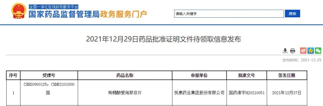 [1]中国国家药监局12月29日药品批准证明文件待领取信息. Retrieved Dec 29,2021, from https://www.nmpa.gov.cn/zwfw/sdxx/sdxxyp/yppjfb/20211229091120175.html