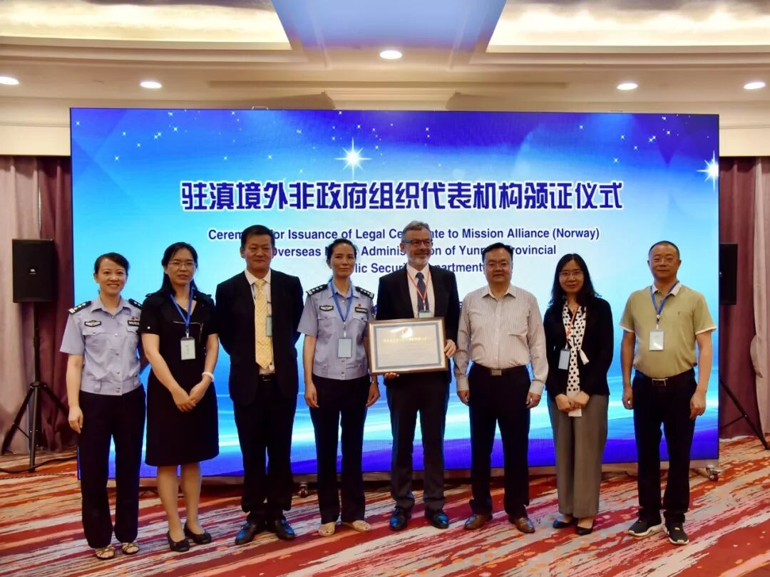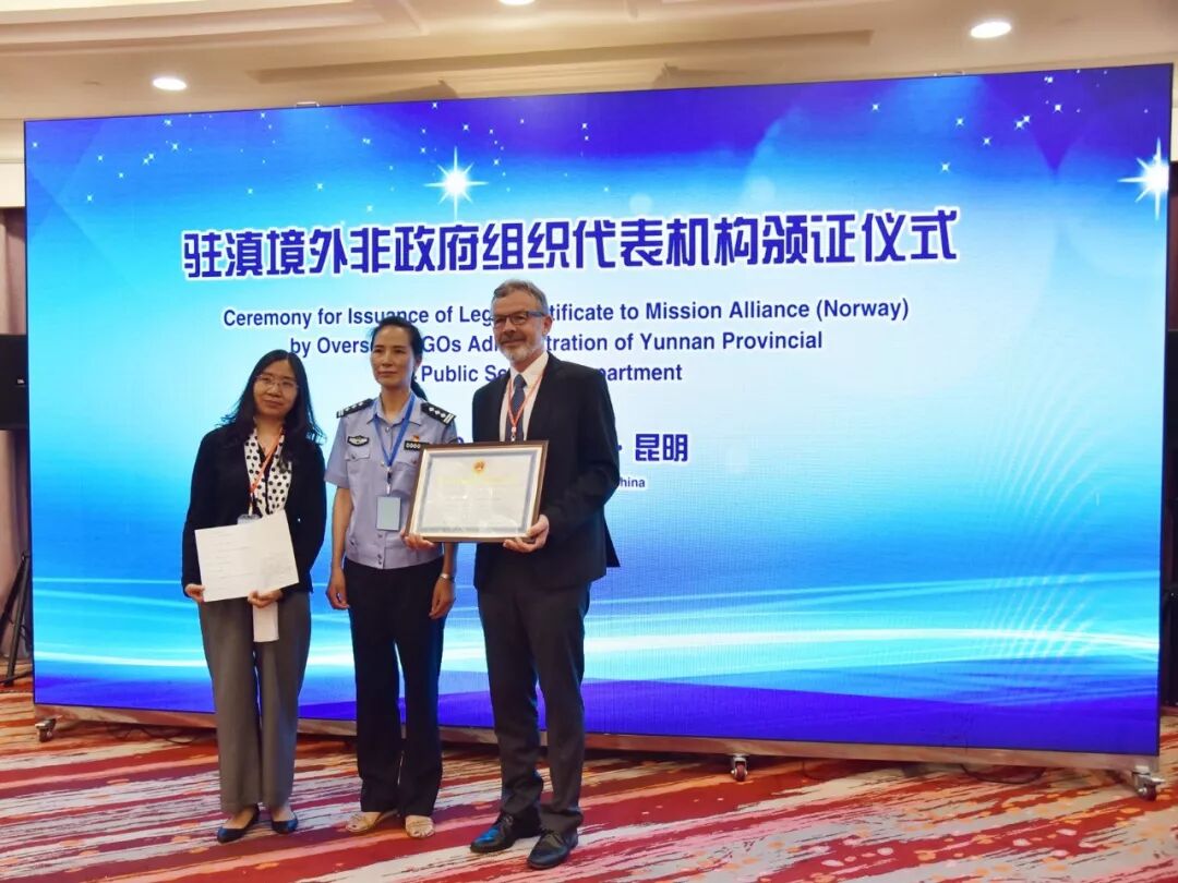 近期,云南省公安厅境外非政府组织管理办公室为协力会(挪威)云南代表处颁发登记证书。挪威协力会中国区域主任Jorgen Haug先生和首席代表蔡迎红女士出席颁证仪式。
