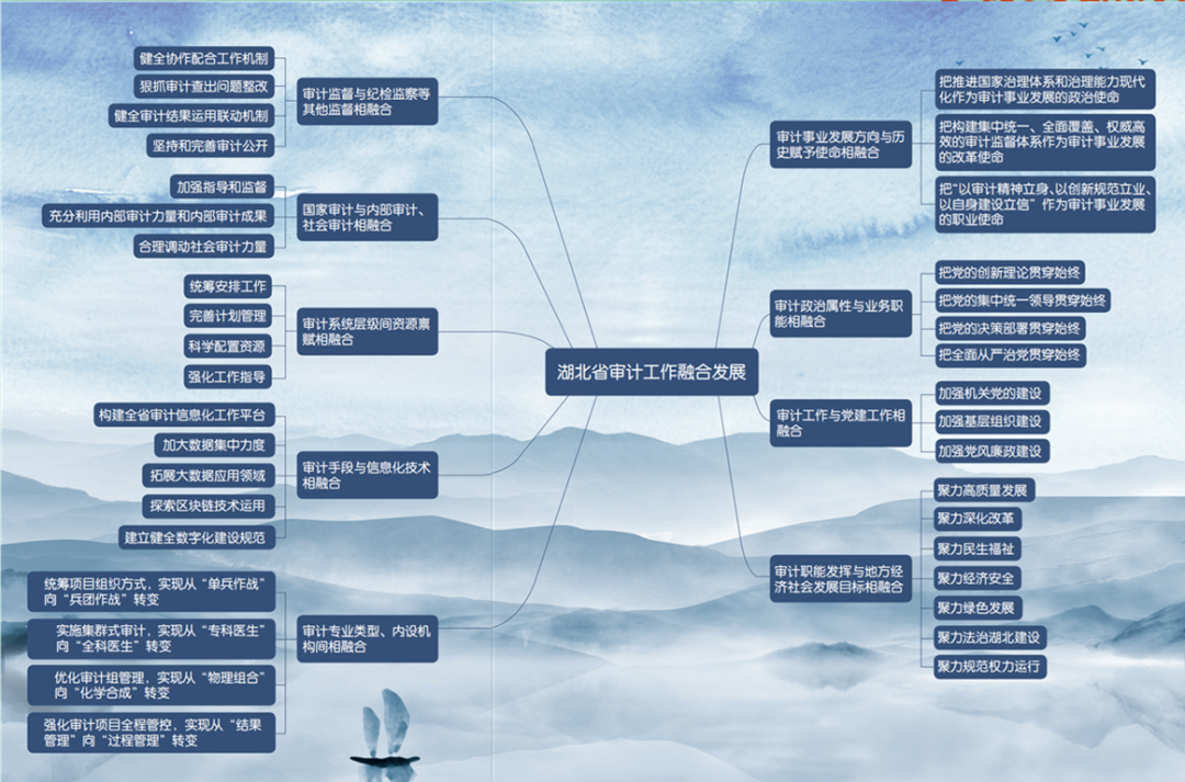2020年4月,《湖北省审计厅关于推进全省审计工作融合发展的指导意见》出台,勾画了湖北审计融合发展的新图景,明确指导思想、基本原则、主要目标、主要内容和保障措施。该意见规划了“九大融合”路径:审计事业发展方向与历史赋予使命相融合,审计政治属性与业务职能相融合,审计工作与党建工作相融合,审计职能发挥与地方经济社会发展目标相融合,审计专业类型、内设机构间相融合,审计手段与信息化技术相融合,审计系统层级间资源禀赋相融合,国家审计与内部审计、社会审计相融合,审计监督与纪检监察等其他监督相融合。“九大融合”环环相扣,既集成了湖北审计三十多年实践的系统经验,也契合了新时代审计治理的任务要求。
