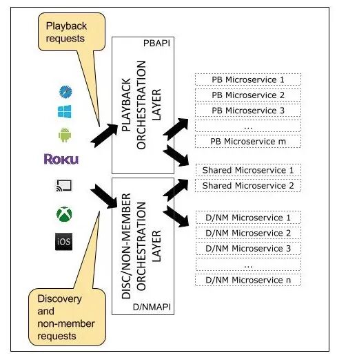 播放 API 将调用一个或一系列微服务来满足请求。图 1 中的播放应用服务、引导服务和缓存控制服务可以视为微服务。