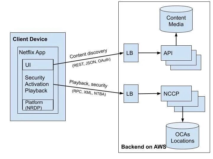 当订阅者单击应用或设备上的播放按钮时,客户端将与 AWS 上的后端和 Netflix CDN 上的 OCA 对话以流传输视频。下图说明了 playback 流程的工作机制:
